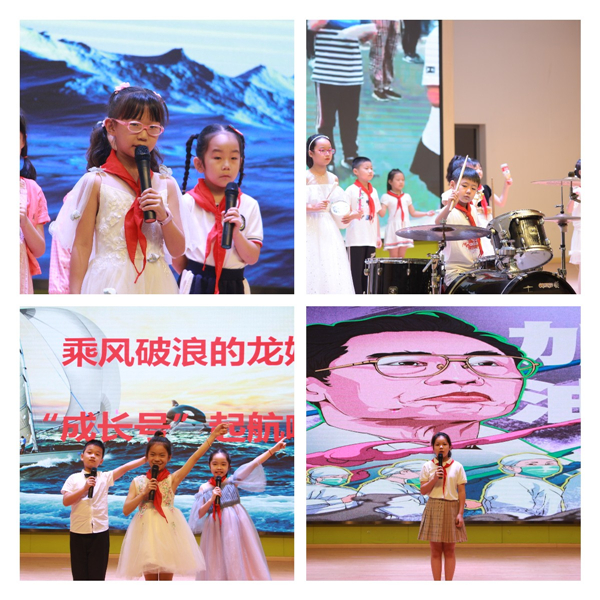 “我爱那湛蓝的大海,听海浪轻轻拍击礁石的声音,感受令人心旷神怡的海风。”“我爱航海家们,哥伦布发现了新大陆,郑和七下西洋,一代一代的航海家,勇敢不屈。”“我有一个梦,梦到自己成了一名水手长,跟着一支航海队伍出行。”阳光灿烂,带上航海梦去探索发现吧!五艘航海船已整装待发,它们分别是:一年级的“梦想号”;二年级的“健康号”;三年级的“璀璨号”;四年级的“成长号”;五年级的“腾飞号”。奔流不息,它们载梦出发!一年级的六位小朋友回顾了入队仪式,分享乐入队感受;二年级的五位五自龙娃代表分享了抗疫期间的自学生活;三年级的五位同学分别表演了和清明节、五一劳动节、六一儿童节、端午节(父亲节)、体艺节紧密联系的节目;四年级的三位同学唱出了十岁的愿望,分享了参加成长仪式的感受;五年级的江苏好少年、龙城好少年、雕庄街道演讲比赛风采奖获得者依次进行了分享,他们的优秀令人称赞,他们的奋进值得学习。