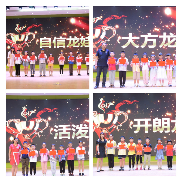 最后,谢校长、李主任、王芬老师、蒋茜老师分别为自信龙娃、大方龙娃、活泼龙娃、开朗龙娃代表颁发了奖状。谢校长还为龙娃形象大使颁发了奖状并且合影留念。