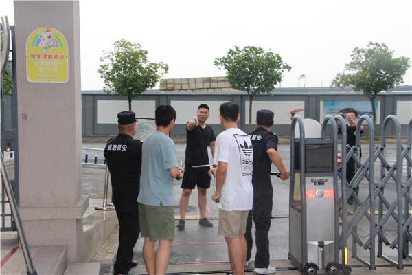 大家纷纷前往校门口查看,竟然是一名“歹徒”想持刀闯入校园,准备行凶,情况万分危急。这时候门卫立刻持防暴盾牌与“歹徒”对峙,并迅速呼喊同伴和老师与其周旋,值班老师也第一时间拨打了110报警电话。不一会儿,执勤警察就赶到学校,严厉警告“歹徒”放下凶器,“歹徒”看到装备精良的警察,自知大势已去,最后放下刀具放弃了抵抗。随即就被警察按倒在地,抓捕回了公安局。