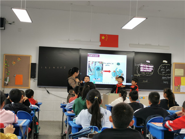 我校韩雪老师准备了一节精彩有趣的绘本课《Can I play with you?》。小象因为粗鲁的性格,没有小动物愿意和他玩,它很伤心,它不知道为什么大家都不和玩,后来它在鸭妈妈的提醒下他变得很有礼貌,大家都愿意和它玩。韩雪老师从主题意义出发,挖掘文本的育人价值,巧妙设计教学环节,让学生在学习语言知识时,体会小象的心情变化,有所感有所悟。