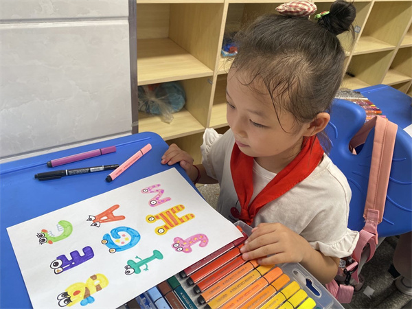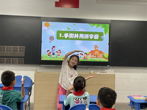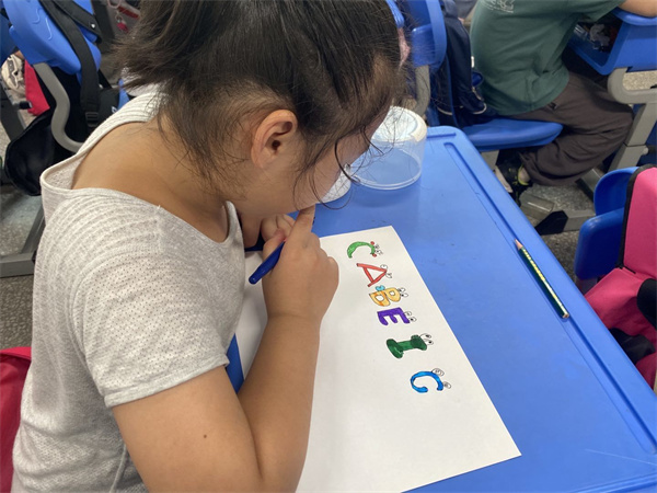 快看!学生们个个都面带笑容的在扭动着身体,从他们的表情中可以看出,他们非常的开心!今天下午学生首先通过视频学跳英语字母操、设计字母、用身体拼字母等方式初步感受英语的魅力,消除对陌生学科的紧张和排斥。随后老师带领手绘英语字母,加深学生对英语的印象,激发学生对英语的喜爱。